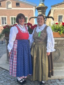 Die von uns normalerweise getragene Böhmerwäldler Festtagstracht ist bei den Frauen ein einfarbiges, eher schlichtes Dirndl. Die Besonderheit sind die langärmlige, aufwendig in Handarbeit gesmokten Bluse sowie zueinander passend ein Schultertuch und eine Schürze. Beim Kirchgang tragen die verheirateten Frauen ein schwarzes Kopftuch, das man auf dem unteren Bild sehen kann. Unverheiratete Mädchen tragen eine Goldhaube.